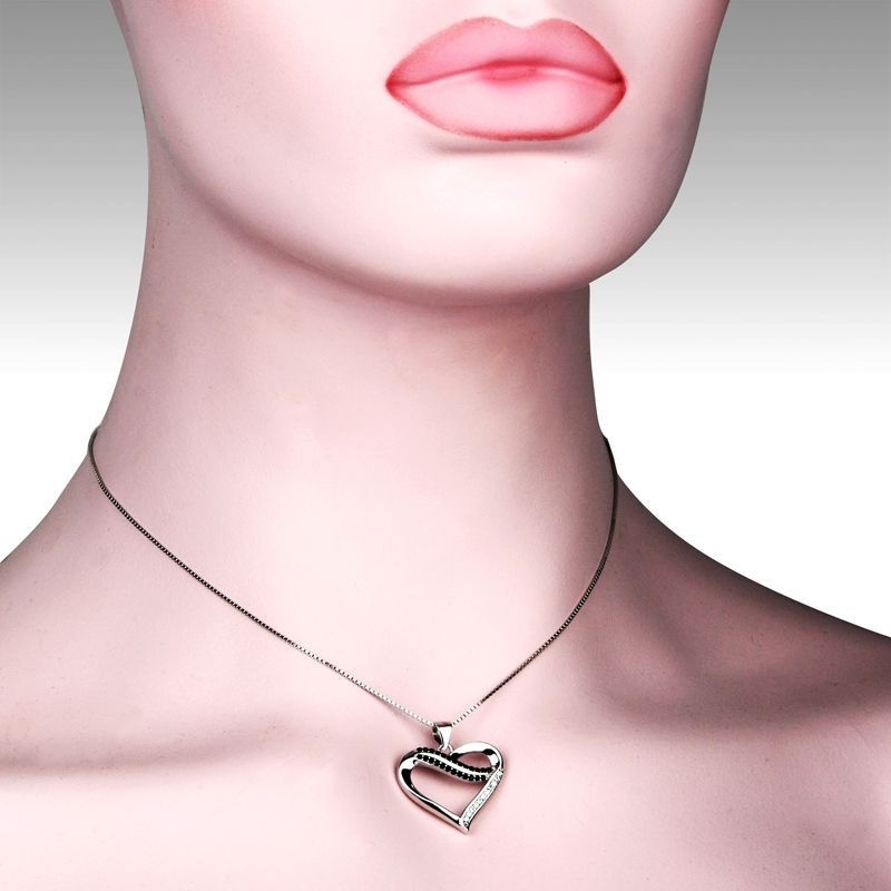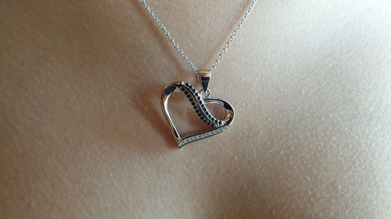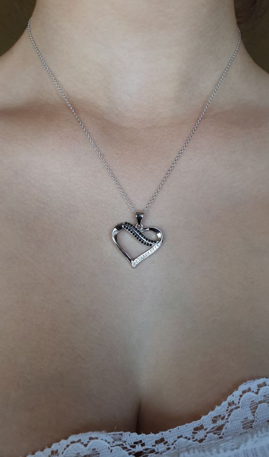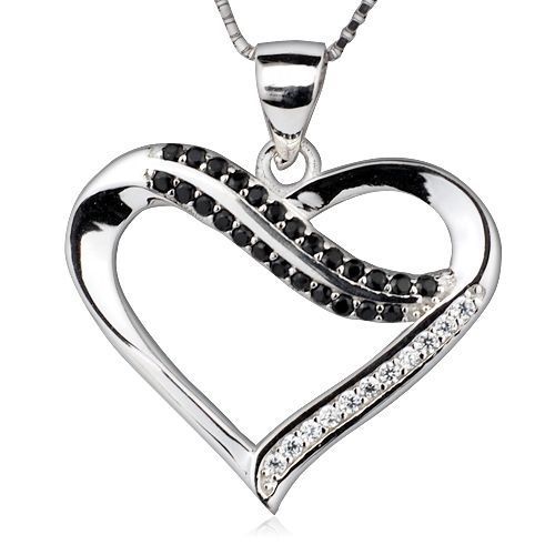 Stříbrný řetízek s přívěškem ve tvaru srdce. Přívěsek srdce je zdoben čirými a černými zirkony.