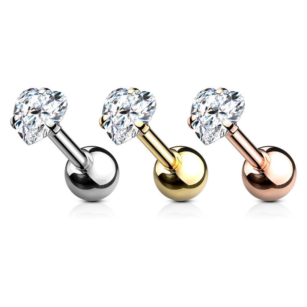 Cartilage piercing do ucha zdobený zirkonem vybroušeným do tvaru srdce.