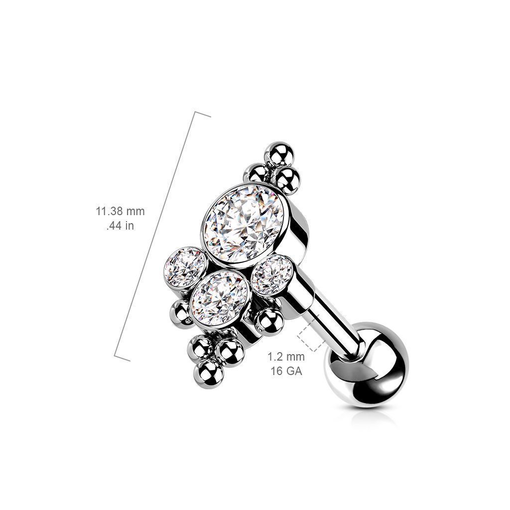 Cartilage piercing do ucha z jedné strany zdobený nádhernou ozdobou s kuličkami a zirkony.