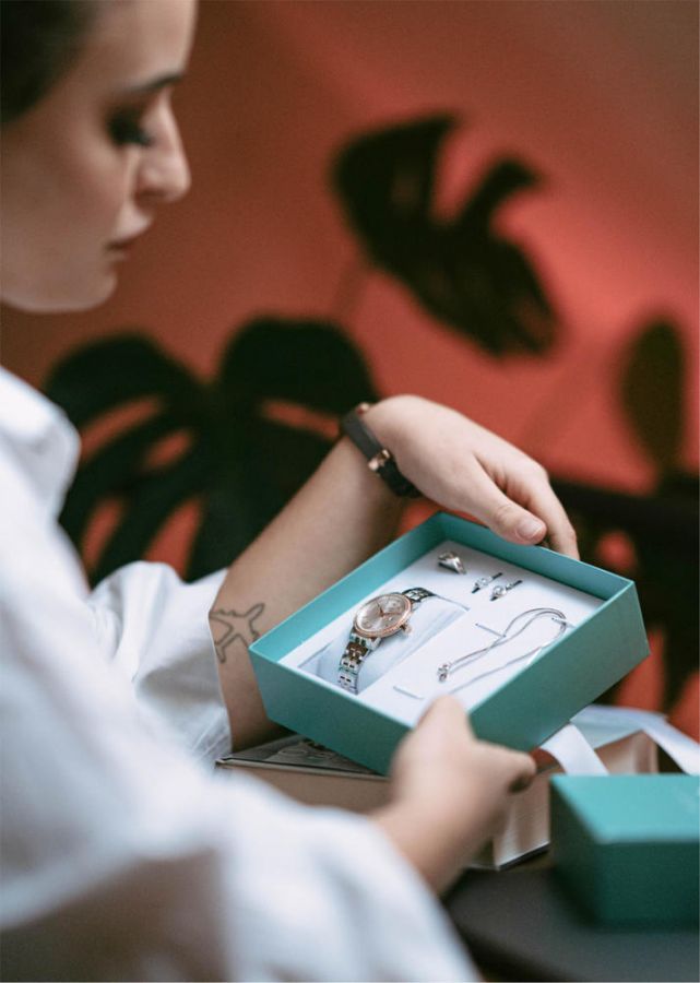 jej o šperkový set - prsten, náušnice, náramek a řetízek. U hodinek