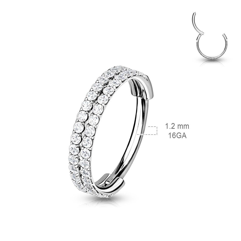 Piercing rozevírací kruh zdobený dvěmi řadami čirých zirkonů.