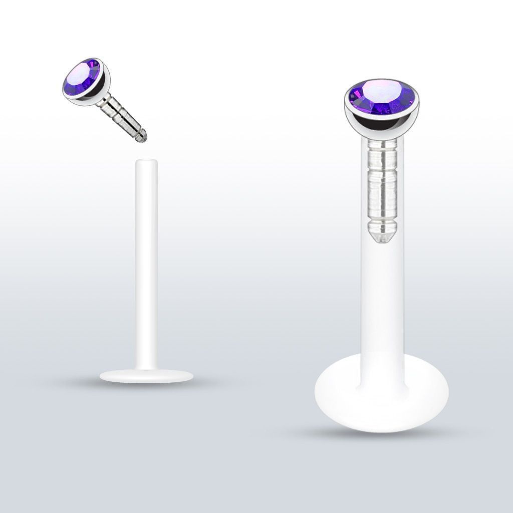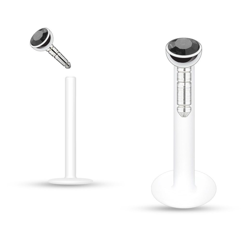 Labreta s tyčkou z bioplastu a kuličkou z chirurgické oceli. Kulička zdobená zirkonem.