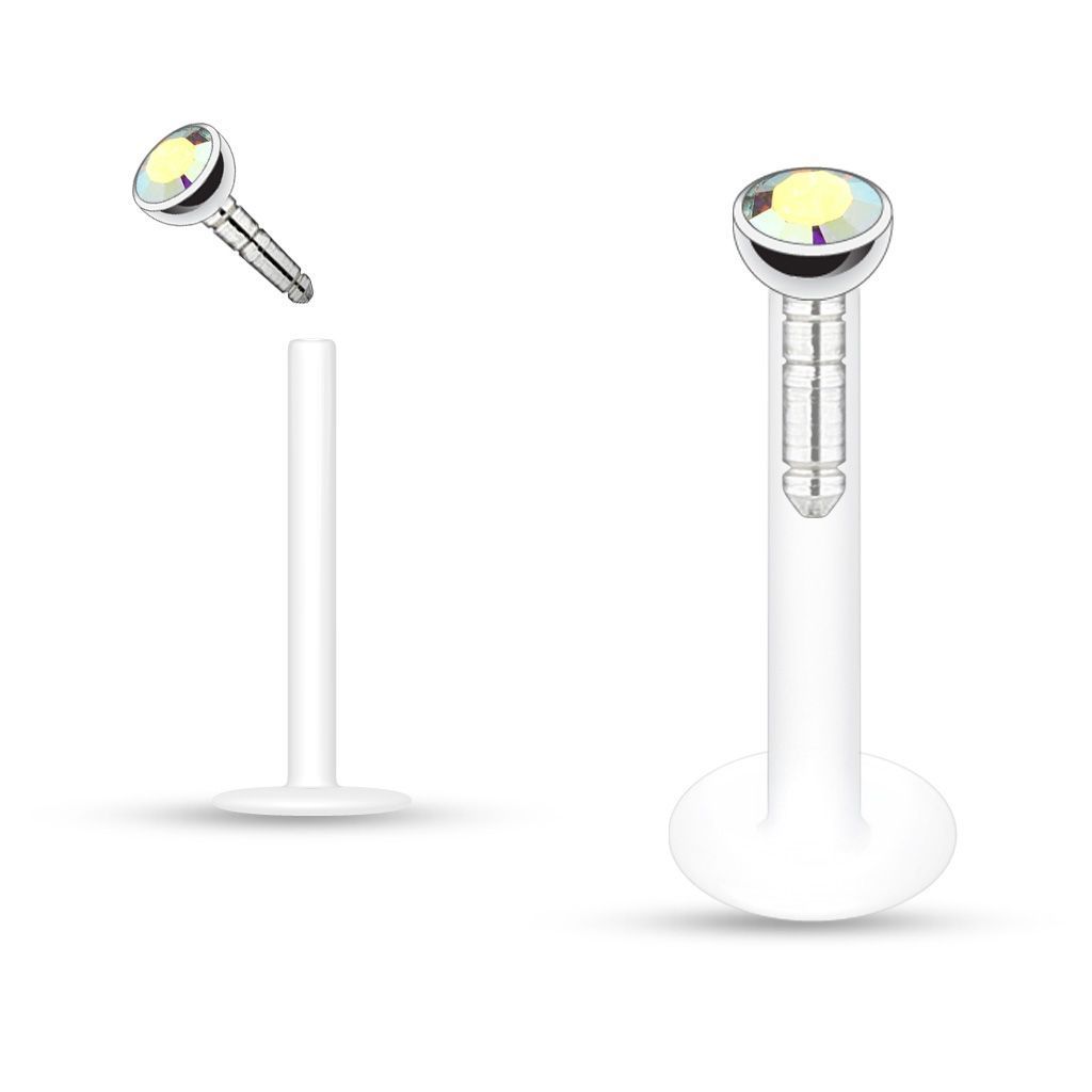 Labreta s tyčkou z bioplastu a kuličkou z chirurgické oceli. Kulička zdobená zirkonem.