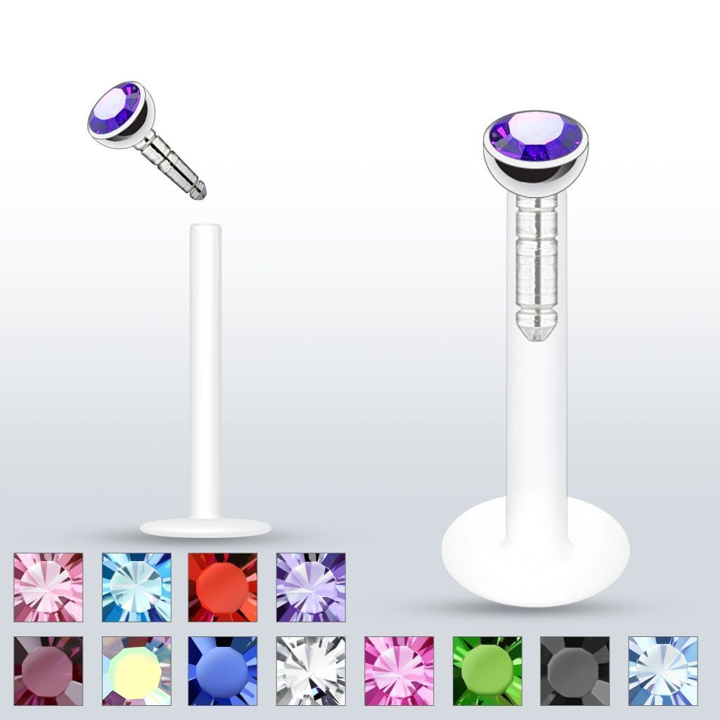 Labreta s tyčkou z bioplastu a kuličkou z chirurgické oceli. Kulička zdobená zirkonem.