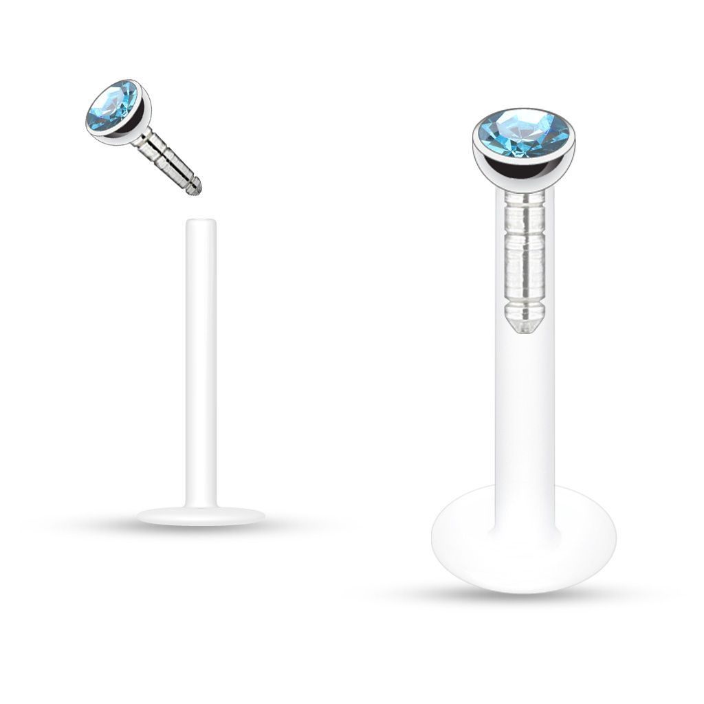 Labreta s tyčkou z bioplastu a kuličkou z chirurgické oceli. Kulička zdobená zirkonem.