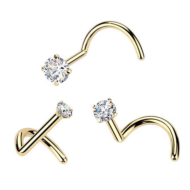 Zlacený titanový zahnutý piercing do nosu - mosovka s moissanitem. Používáme pouze kameny barvy D - nejvyšší stupeň barvy - nabízející ohromující, bezbarvý třpyt, který se velmi podobá diamantům nejvyšší kvality. Každý kámen má čistotu VVS, což znamená, že je prakticky bezchybný.