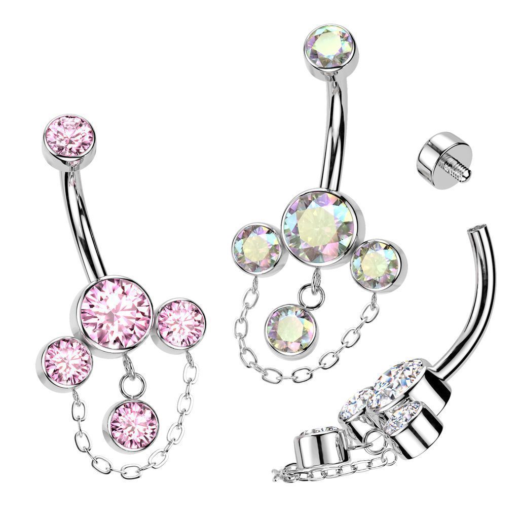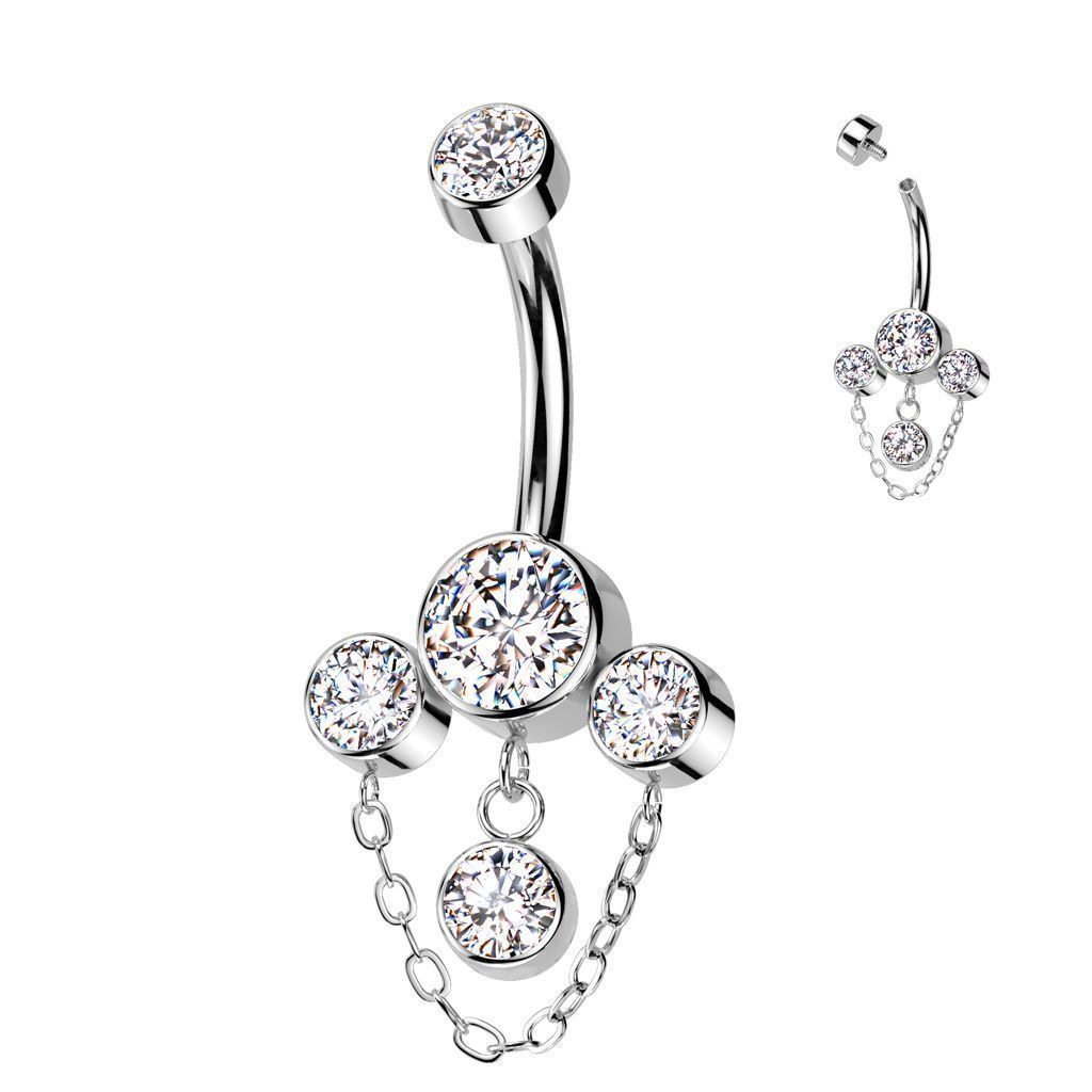Titanový piercing do pupíku s ozdobou ve tvaru třech spojených zirkonů se zavěšeným zirkonem a řetízkem.