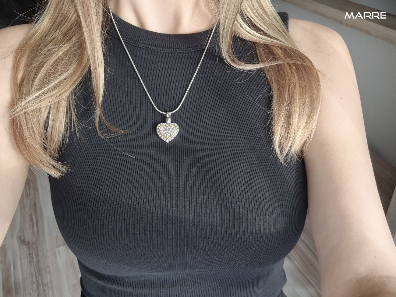 Náhrdelník z chirurgické oceli. Ocelový řetízek s pietním přívěskem ve tvaru srdce. Přívěsek vyroben z certifikované chirurgické oceli 316L. Z přední strany je přívěsek osazen čirými zirkony a zdoben zlacenou linkou ve tvaru srdce v barvě žlutého zlata. Vnitřní prostor přívěsku umožňuje uchovat malou část spálených pozůstatků zesnulých milovaných, pramínek vlasů nebo sušené obřadní květy. Část na popel je uzavřena těsnícím závitovým šroubem.