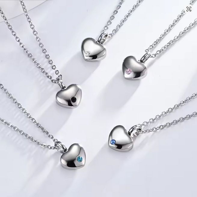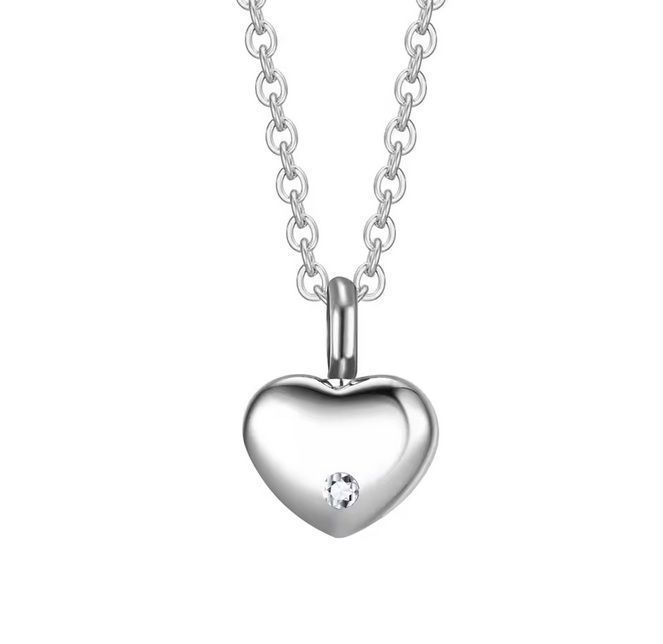 Náhrdelník z chirurgické oceli. Ocelový očkový řetízek s pietním přívěskem ve tvaru srdíčka zdobeného zirkonem. Náhrdelník vyroben z certifikované chirurgické oceli 316L. Vnitřní prostor přívěsku umožňuje uchovat malou část spálených pozůstatků zesnulých milovaných, pramínek vlasů nebo sušené obřadní květy. Část na popel je uzavřena těsnícím závitovým šroubem.