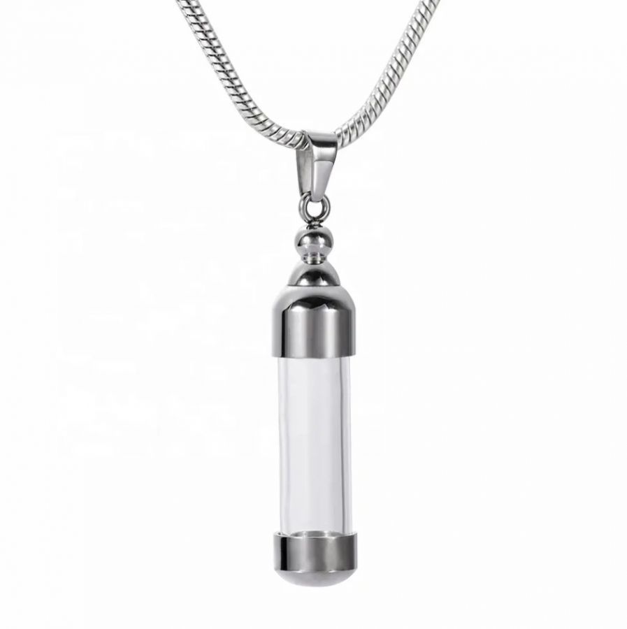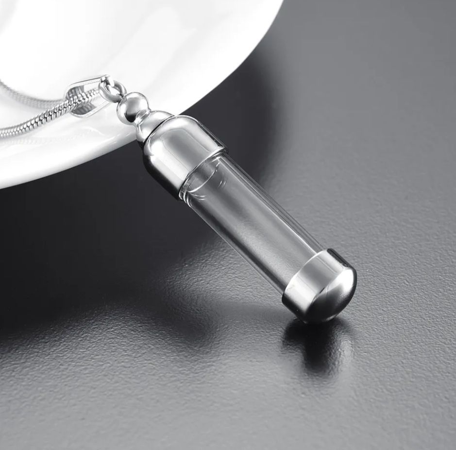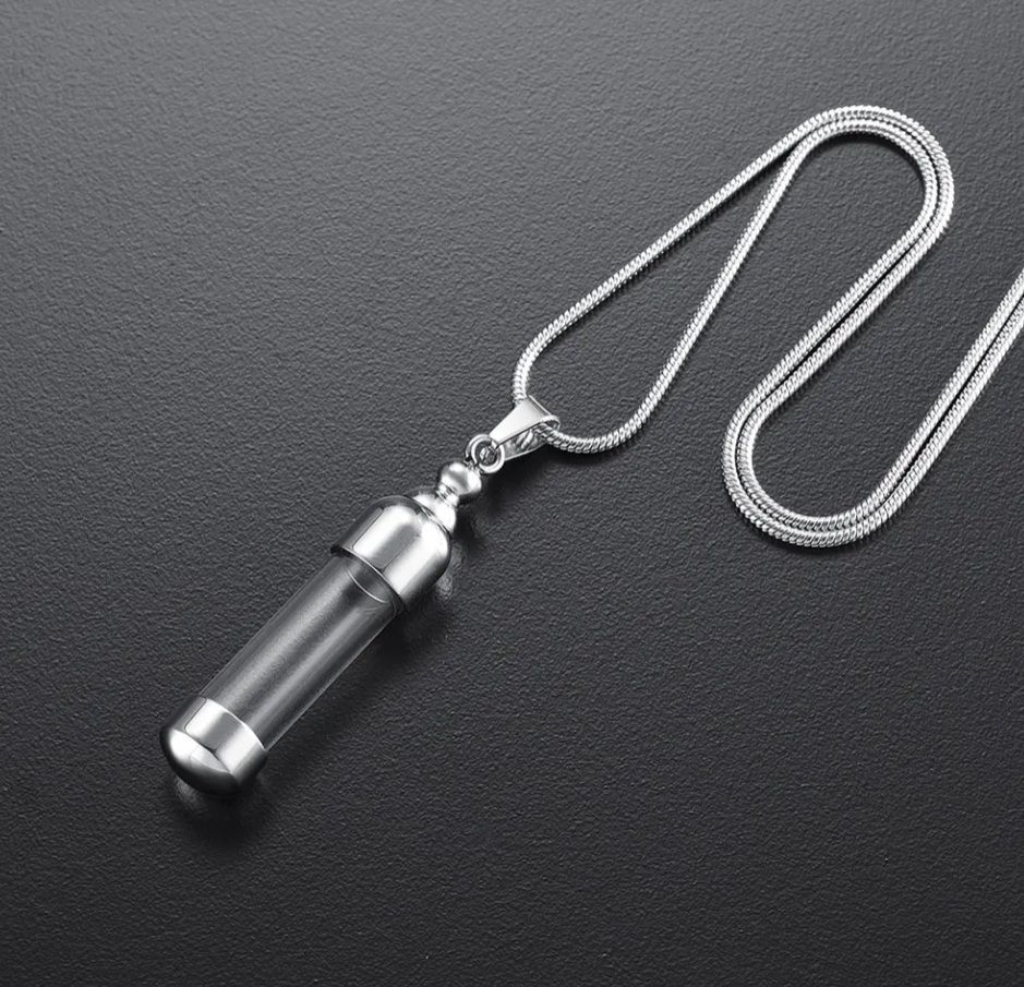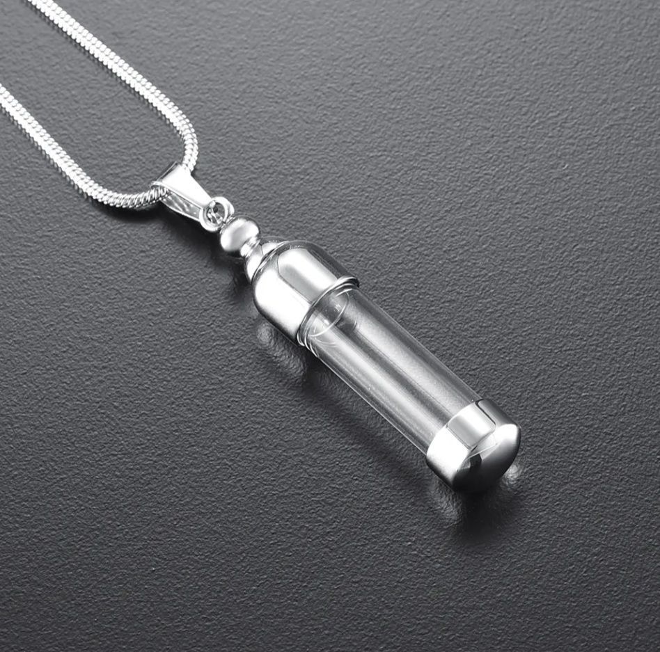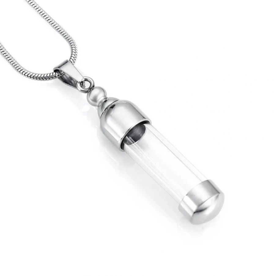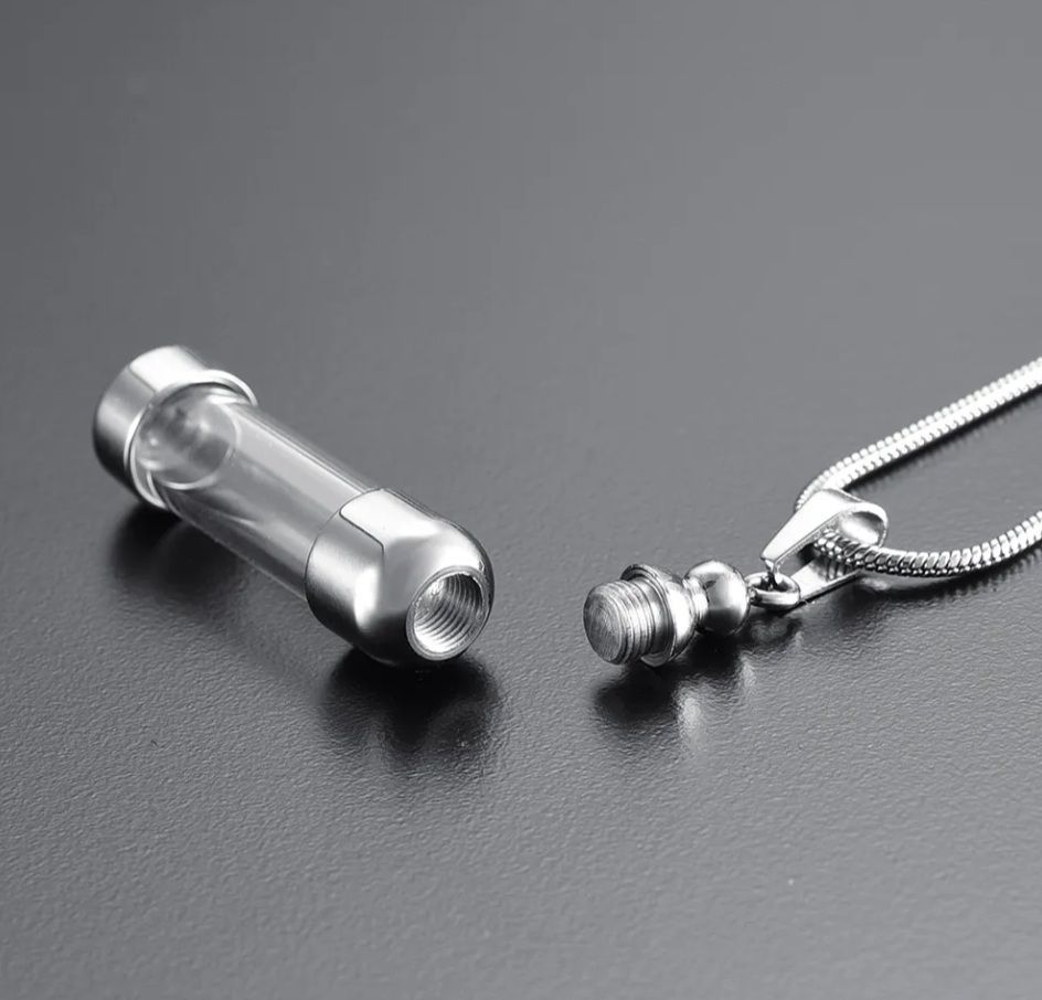 Náhrdelník z chirurgické oceli. Ocelový řetízek kulatý had s pietním přívěskem - skleněným válečkem uchyceným v oceli. Po rozšroubování lze skleněný váleček naplnit - vnitřní prostor přívěsku umožňuje uchovat malou část spálených pozůstatků zesnulých milovaných, pramínek vlasů nebo sušené obřadní květy. Část na popel je uzavřena těsnícím závitovým šroubem.