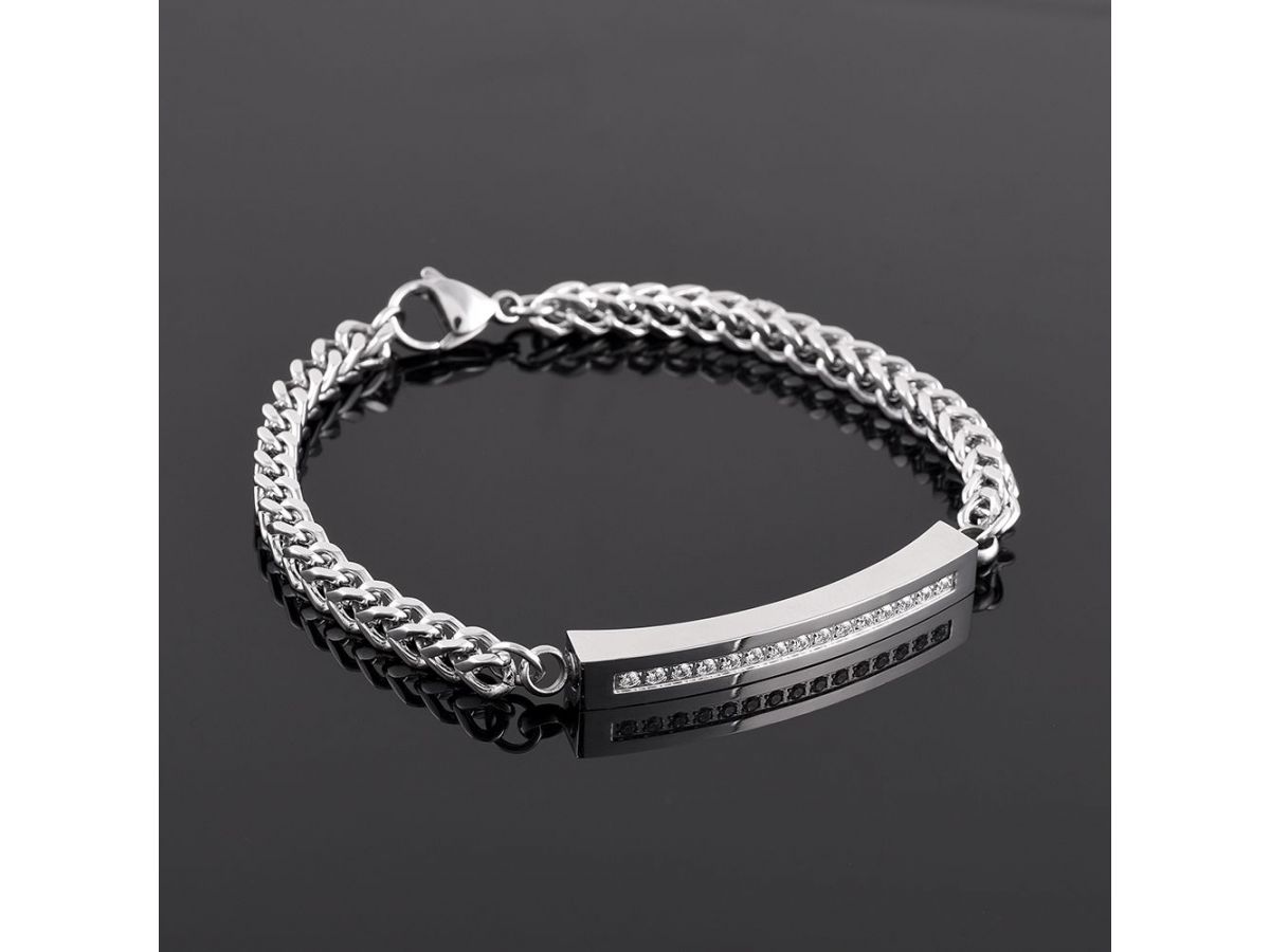 Pietní náramek z chirurgické oceli. Ocelový náramek s pietním hranolkem z chirurgické oceli. Hranol je zdobený čirými zirkony. Náramek je vyroben z certifikované chirurgické oceli 316L. Vnitřní prostor hranolku umožňuje uchovat malou část spálených pozůstatků zesnulých milovaných, pramínek vlasů nebo sušené obřadní květy. Část na popel je uzavřena těsnícím závitovým šroubem.