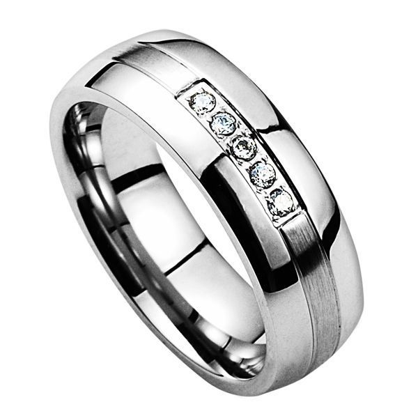Dámský snubní prsten z chirurgické oceli zdobený matným pruhem ve středové linii a 5ti zirkony čiré barvy