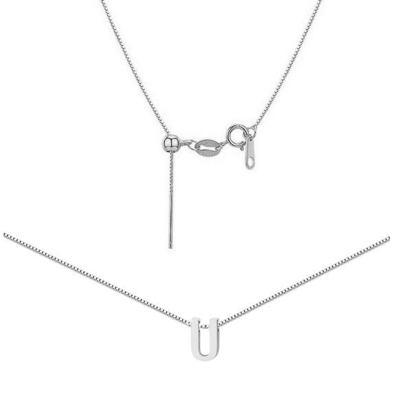 Ocelový náhrdelník - jemný řetízek čtvercového tvaru s libovolně nastavitelnou délkou až 45 cm. Náhrdelník je zdobený navlečeným přívěskem ve tvaru tiskacího písmene.