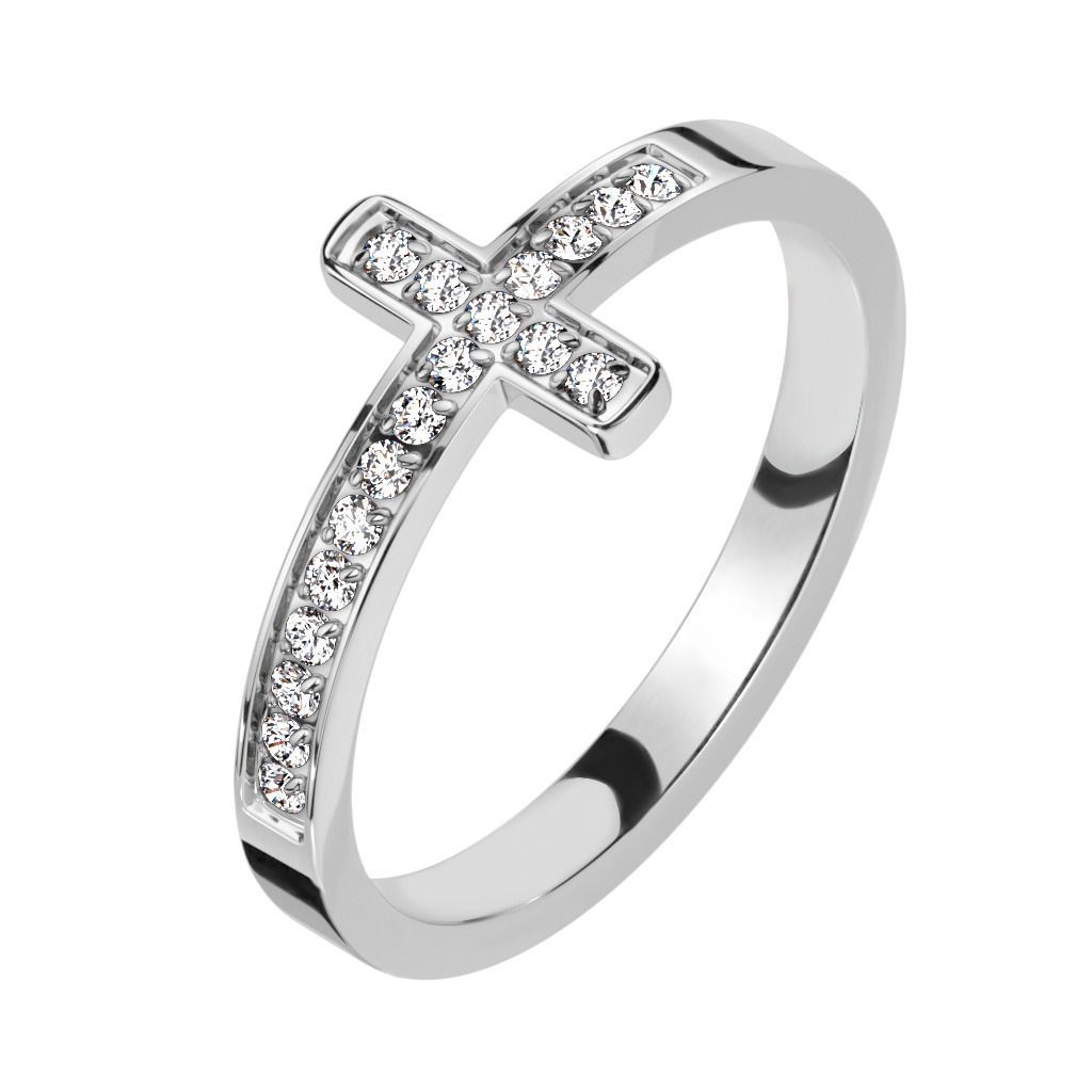 Ocelový prsten ve tvaru křížku zdobený čirými zirkony.