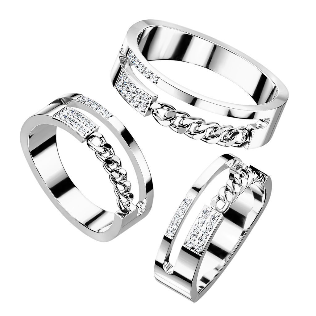 Ocelový prsten s leským povrchem a zirkony. Zdobený motivem řetězu.