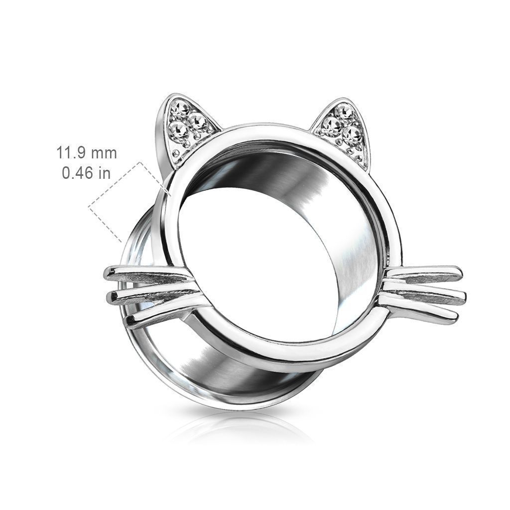 Ocelový tunel do ucha s ozdobou ve tvaru kočičí hlavy.