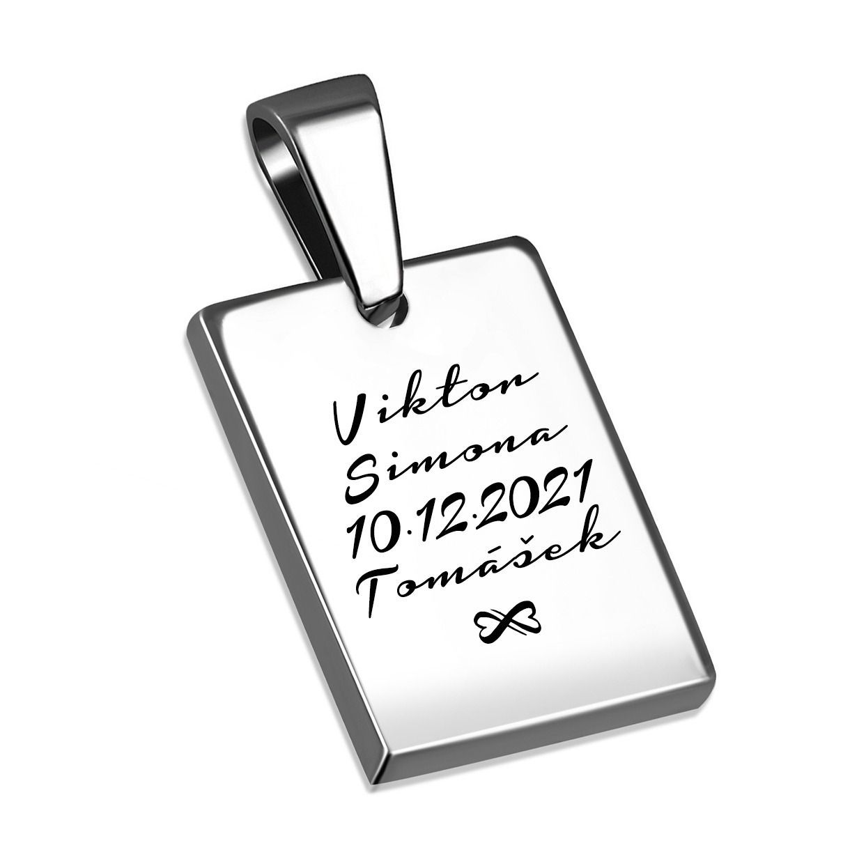 Drobný obdélníkový přívěsek v podobě destičky je vyrobený z nerezové oceli s vysoceleštěným povrchem. Přívěsek může být originálním osobním dárkem pro Vaši ženu, vašeho muže, partnera/partnerku, dědečka/babičku nebo kamaráda/kamarádku k narozeninám, Vánocům nebo jako připomínka mimořádné události či milá vzpomínka na vás.