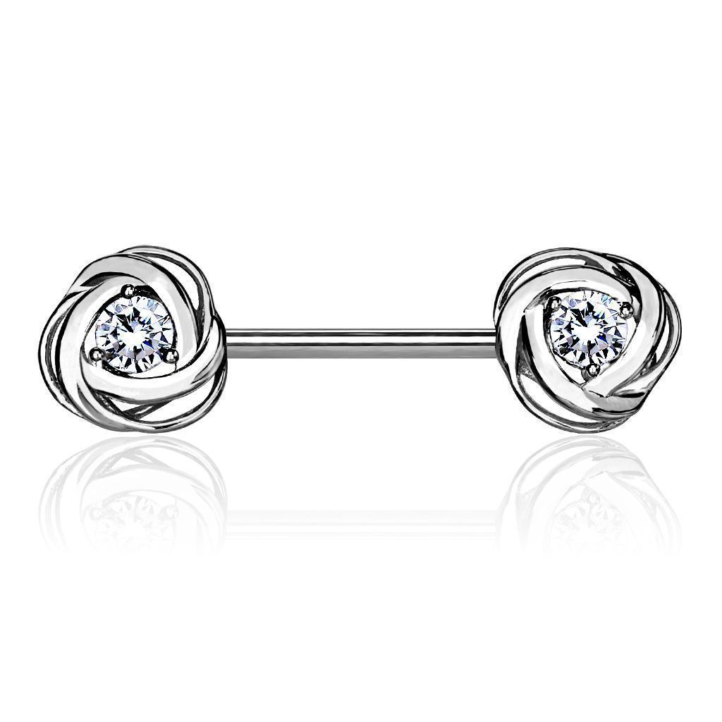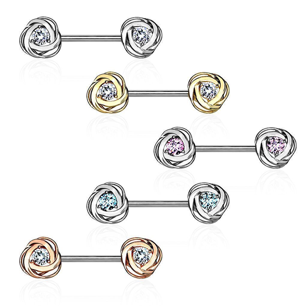 Piercing do bradavky se zlacenými ozdobami s čirými zirkony. Šroubovací je pouze jedna ozdoba, druhá je přidělaná napevno.