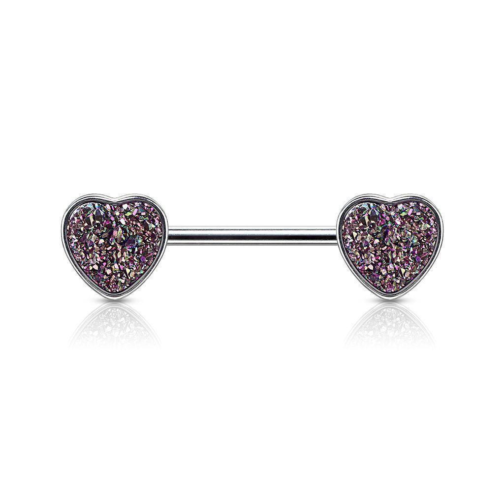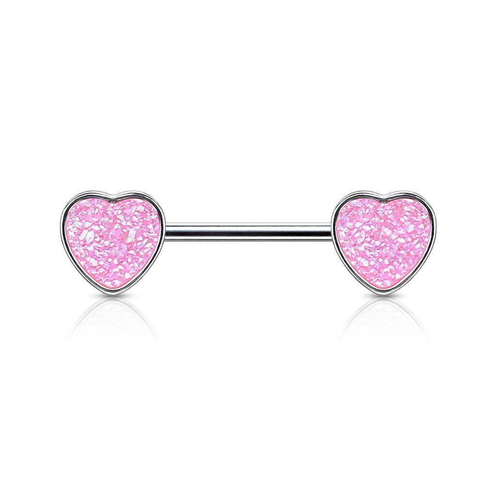 Piercing do bradavky s ozdobami srdíček. Srdce jsou zdobená kamínky.