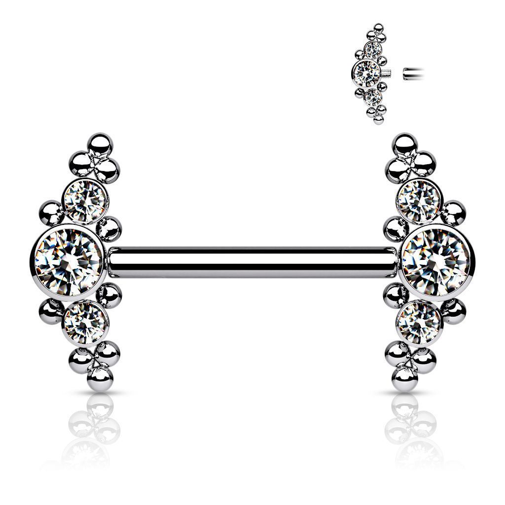 Titanový piercing do bradavky s ozdobami se zirkony, dozdobené droboučkými kuličkami.