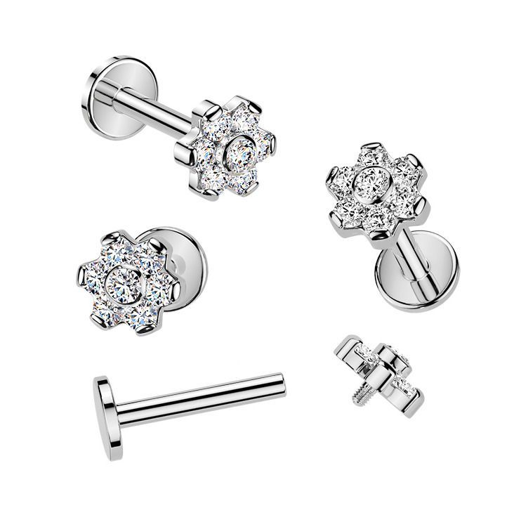 Titanový piercing labret do brady nebo ucha s ozdobou ve tvaru kytičky osázené čirými zirkony.