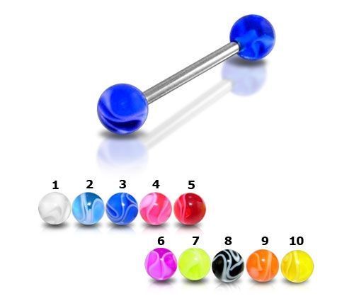Piercing činka do jazyku s akrylátovými kuličkami, které vyniknou pod UV světlem.