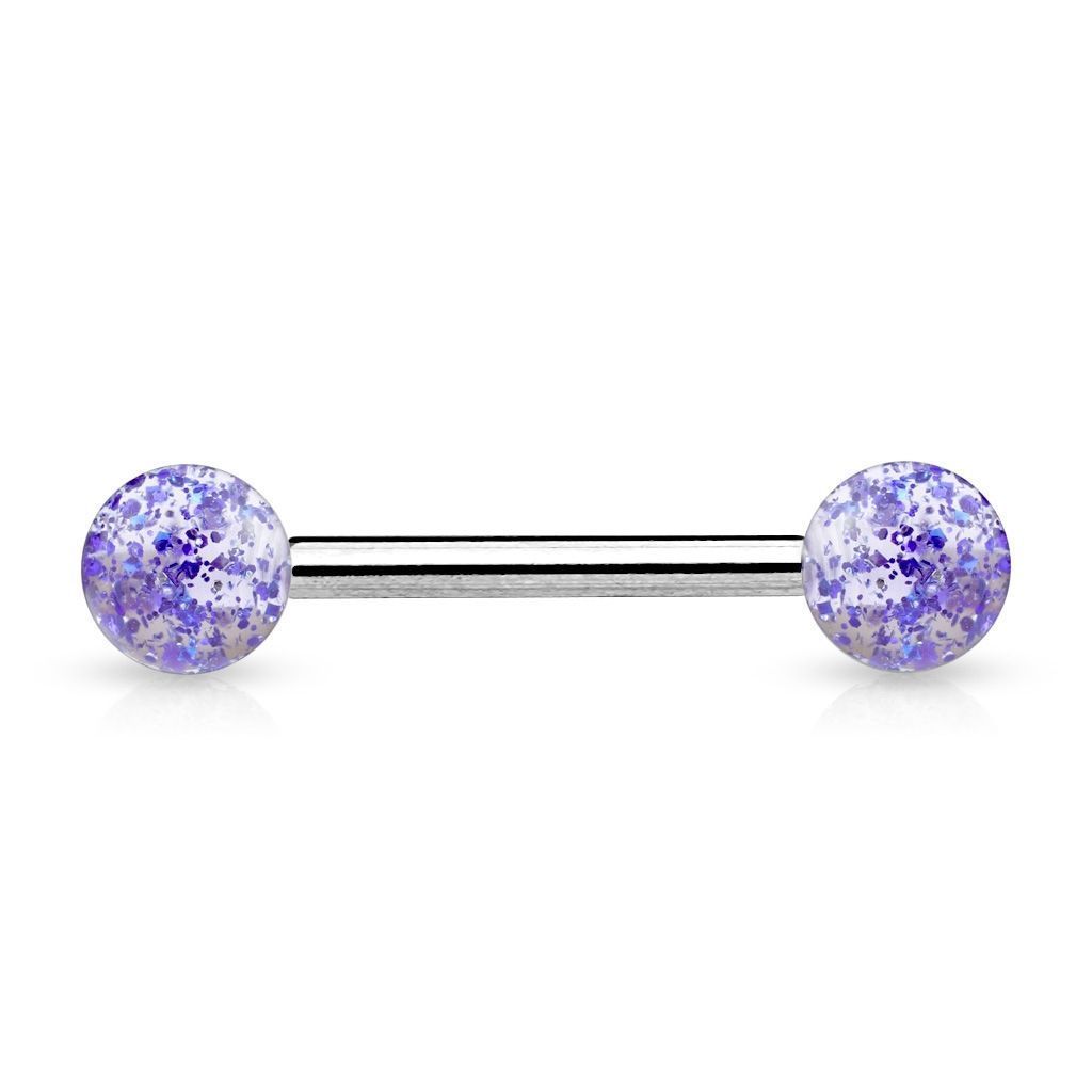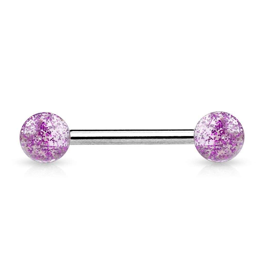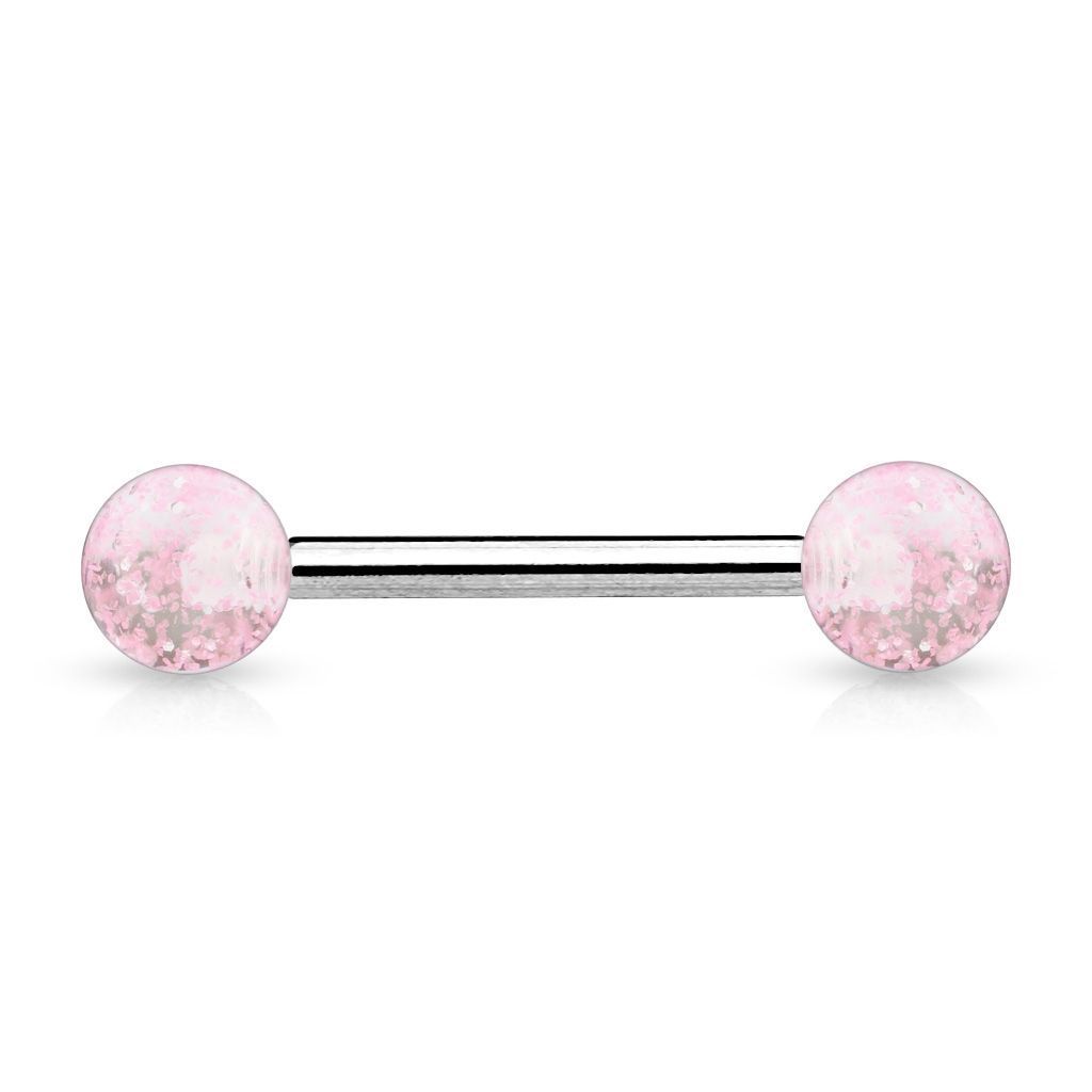 Piercing činka do jazyku. Kuličky s třpytkami vyniknou na UV světle.
