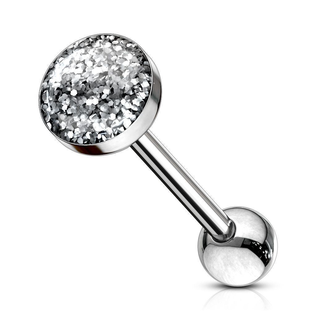 Piercing činka do jazyku z chirurgické oceli. Vrchní kulička je zdobená třpytkami.