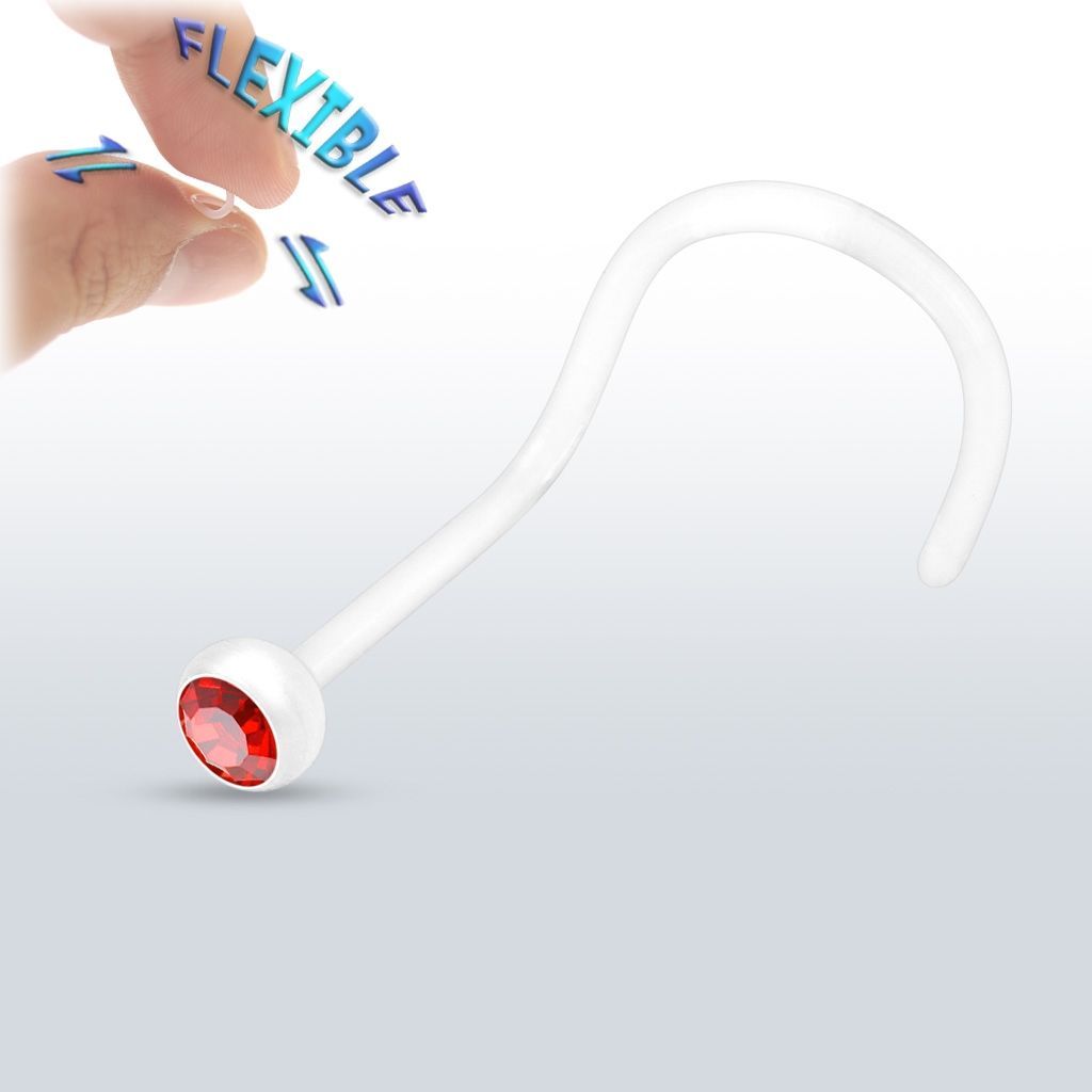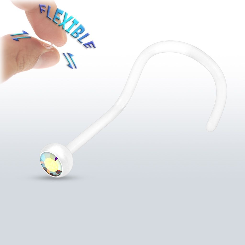Bioplastový zahnutý piercing do nosu zdobený kamínkem. Ohebný, pružný.