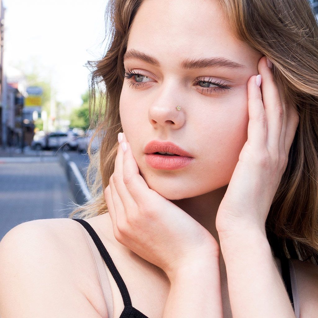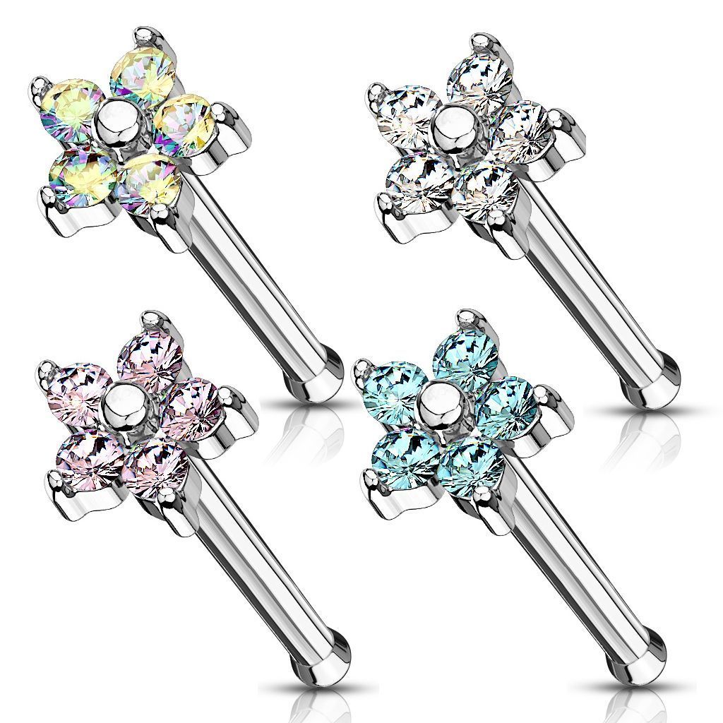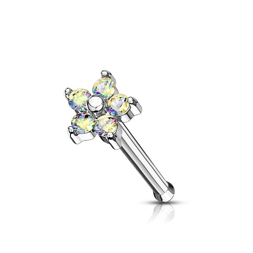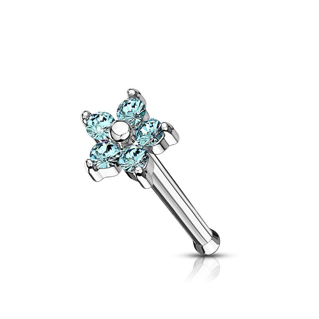 Piercing do nosu zdobený kytičkou, která je osázena zirkony.