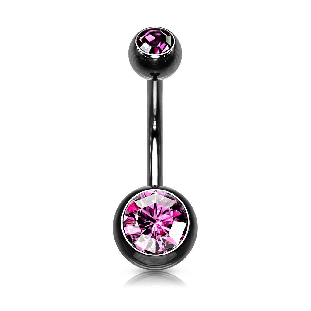Piercingový šperk určený pro piercing pupíku. Povrchově zbarvený. Obě kuličky jsou osazeny zirkonem.