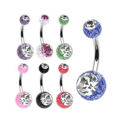 Piercing banánek do pupíku, chirurgická ocel s třpytkovými akrylátovými kuličkami, které vyniknou pod UV světlem. Kuličky jsou navíc osazeny zirkony.