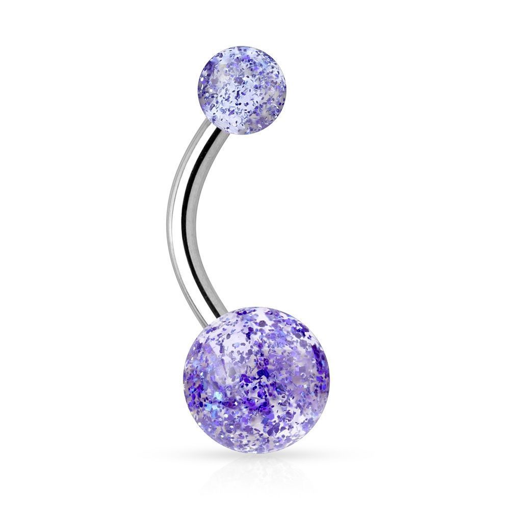 Piercing banánek do pupíku s akrylátovými třpytkovými kuličkami. Kuličky vyniknou pod UV světlem.