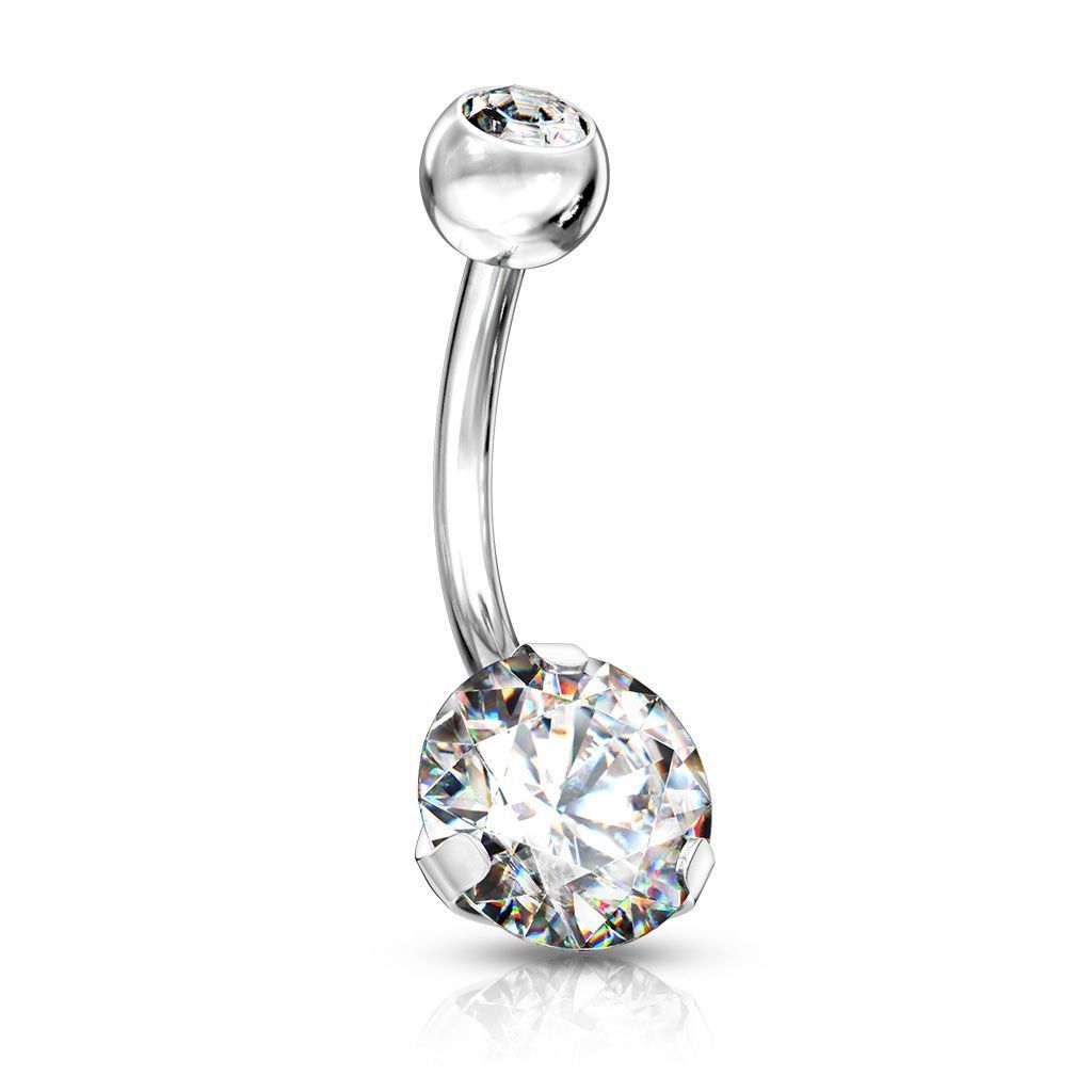 Piercingový šperk určený pro piercing pupíku. S velkým spodním zirkonem a malým zirkonem zasazeným v horní kuličce.