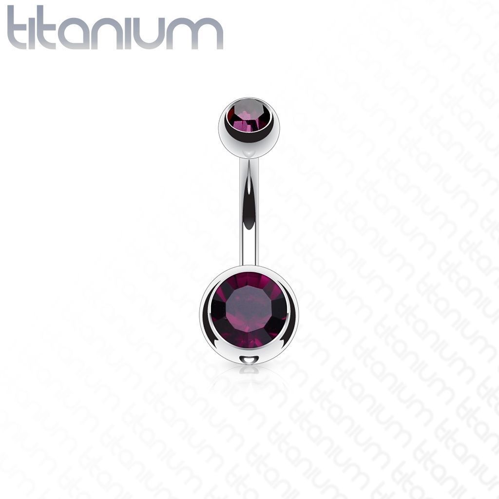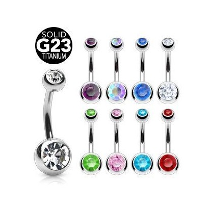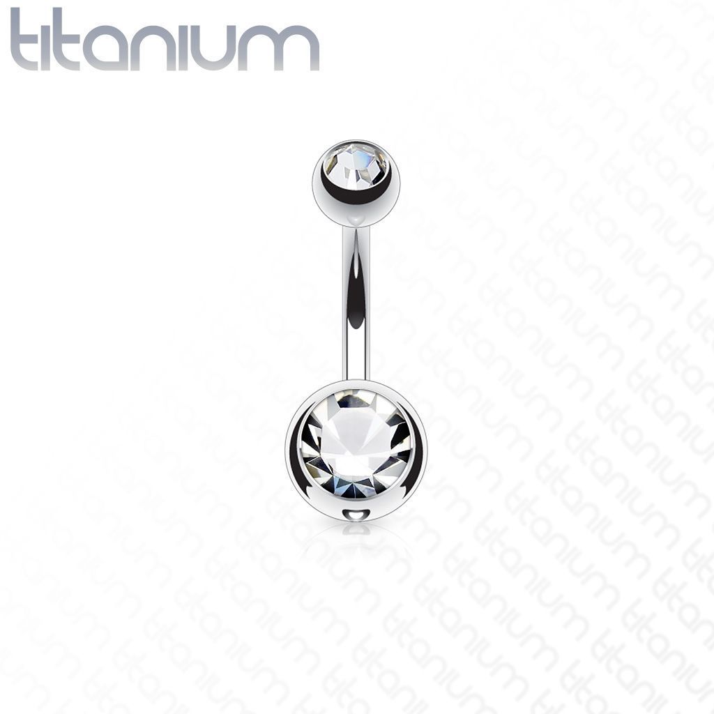 Titanový piercingový šperk určený pro piercing pupíku. Obě kuličky jsou osazené zirkony.