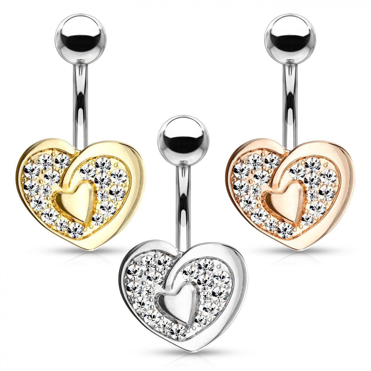 Piercing do pupíku srdce zdobené zirkony čiré barvy.
