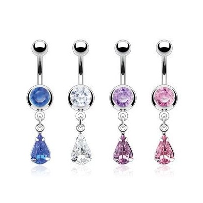 Visací piercing do pupíku s ozdobou ve tvaru kapičky.