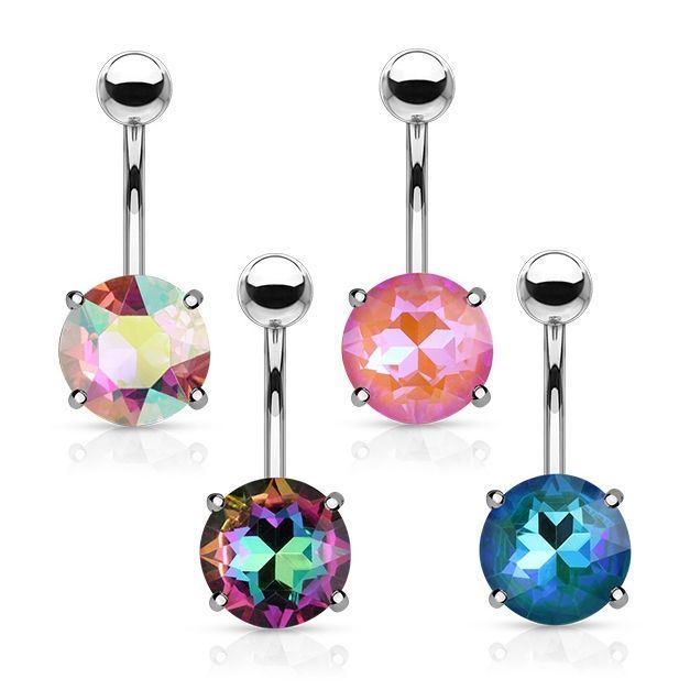 Piercing do pupíku zdobený kulatým broušeným kamenem o průměru 8 nebo 10 mm.