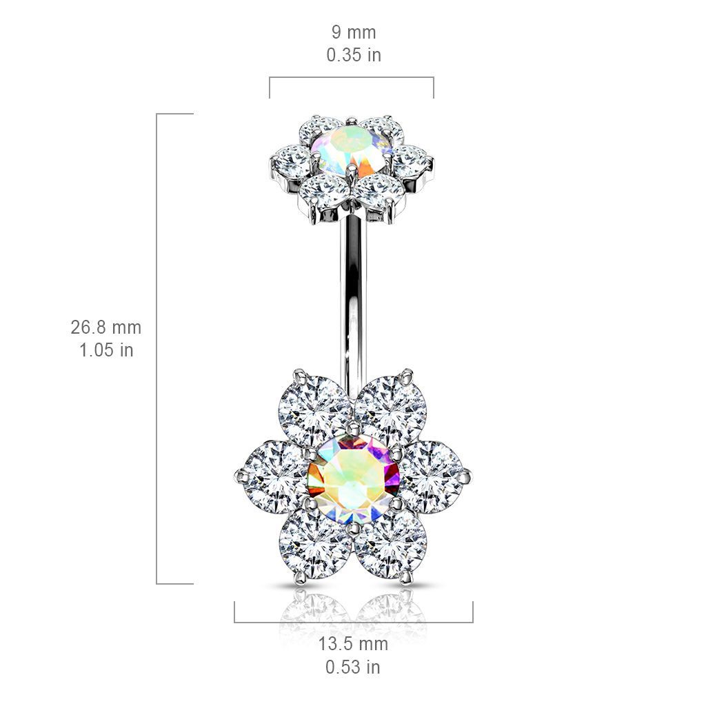 Piercing banánek do pupíku s ozdobami ve tvaru květů. Zdobený zirkony.