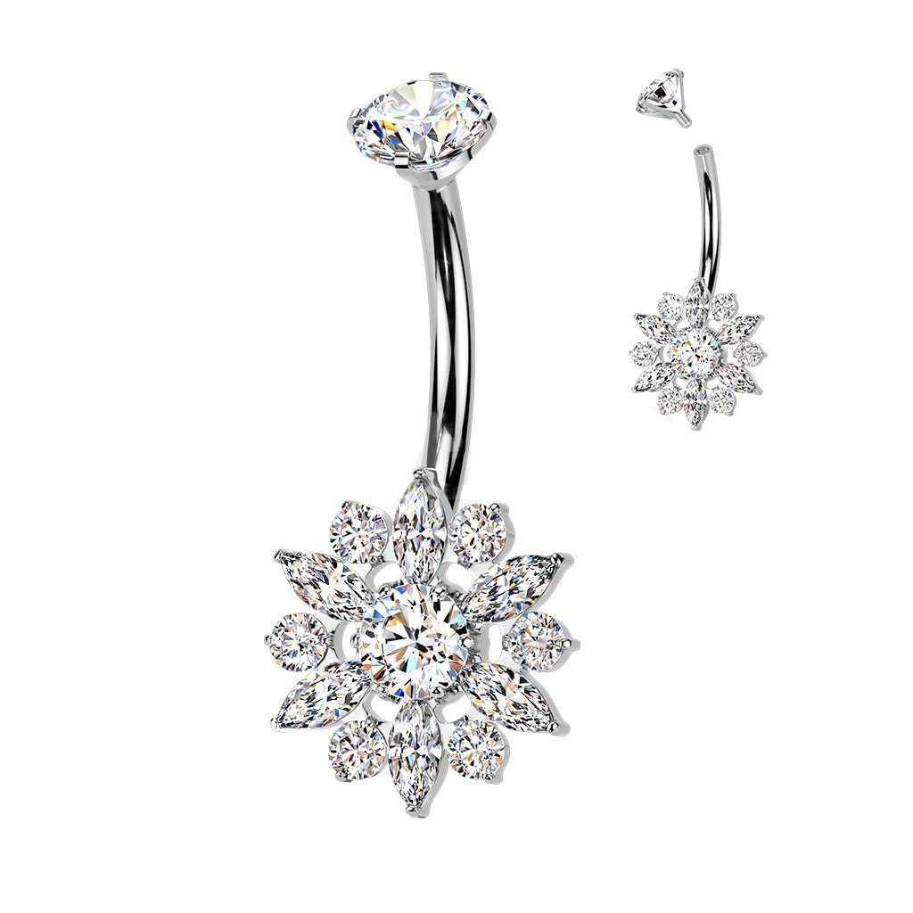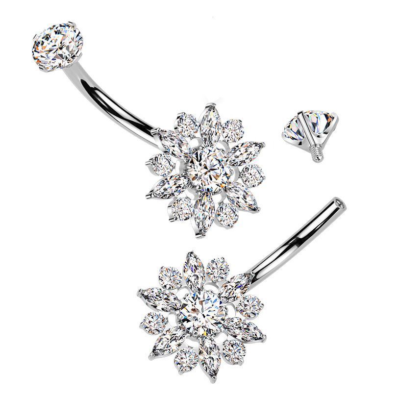 Titanový piercing do pupíku s ozdobou ve tvaru kytičky zdobenou zirkony.