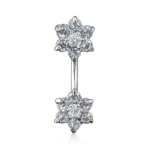 Piercing banánek do pupíku zdobený dvěma kytičkami.