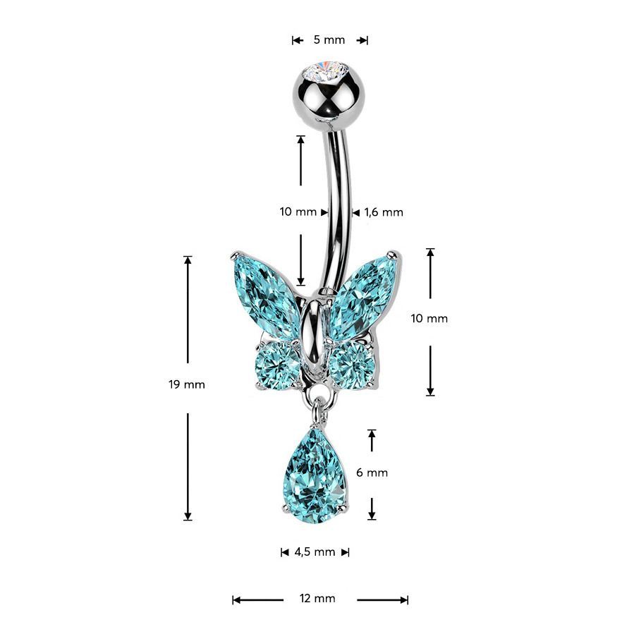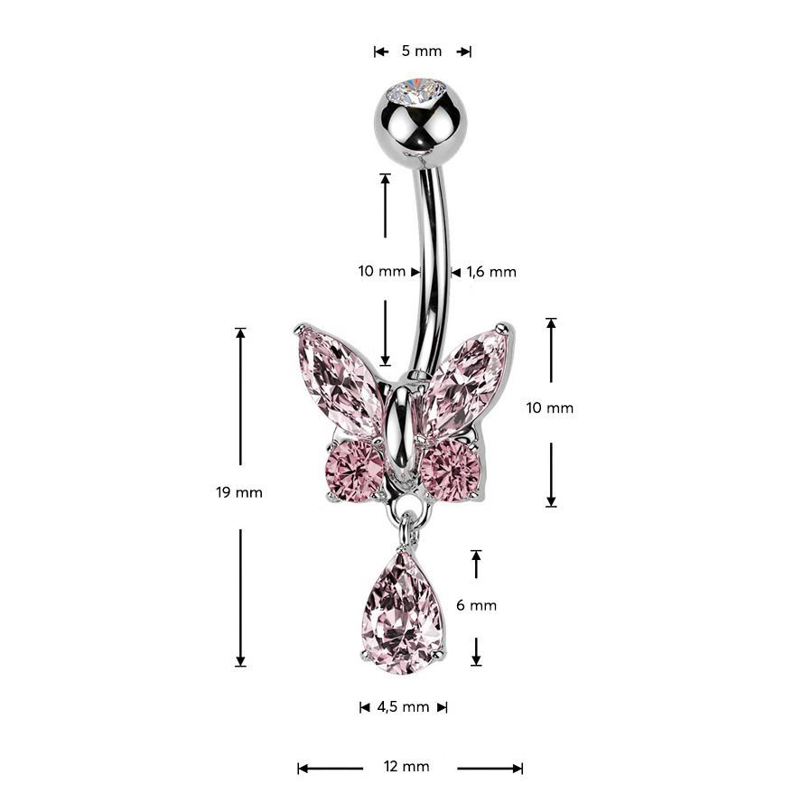 Piercingový šperk určený pro piercing pupíku. S ozdobou ve tvaru mmotýla, který je zdoben zirkony.