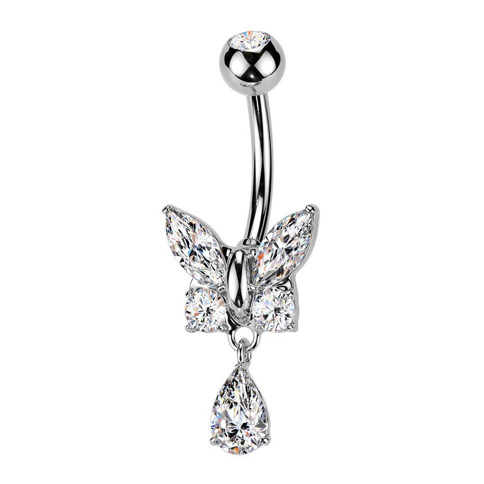 Piercingový šperk určený pro piercing pupíku. S ozdobou ve tvaru mmotýla, který je zdoben zirkony.