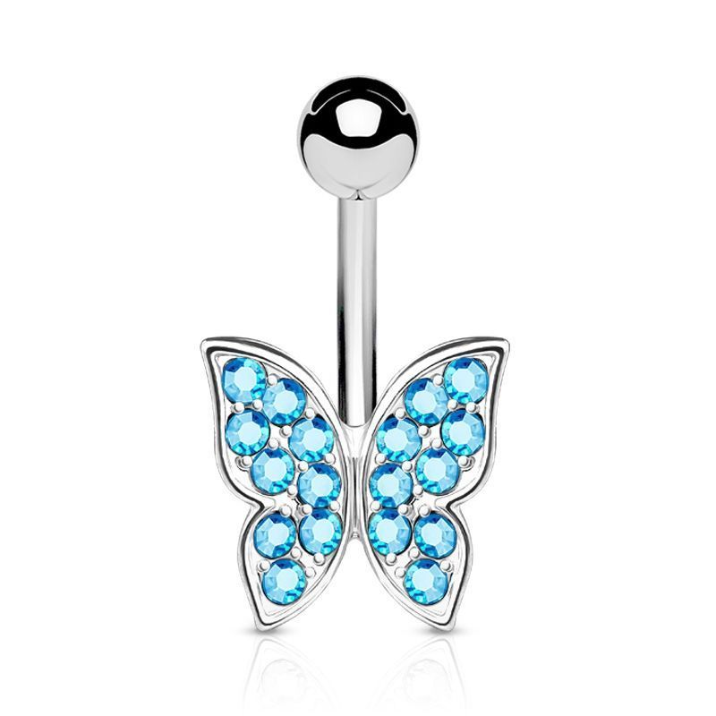 Piercing do pupíku. Piercing zdobený motýlem. Motýlek je osázen zirkony.