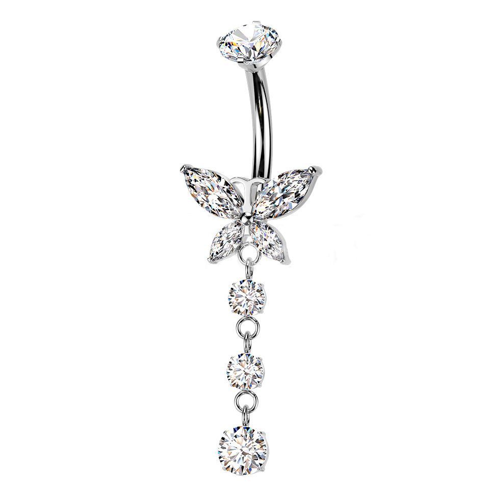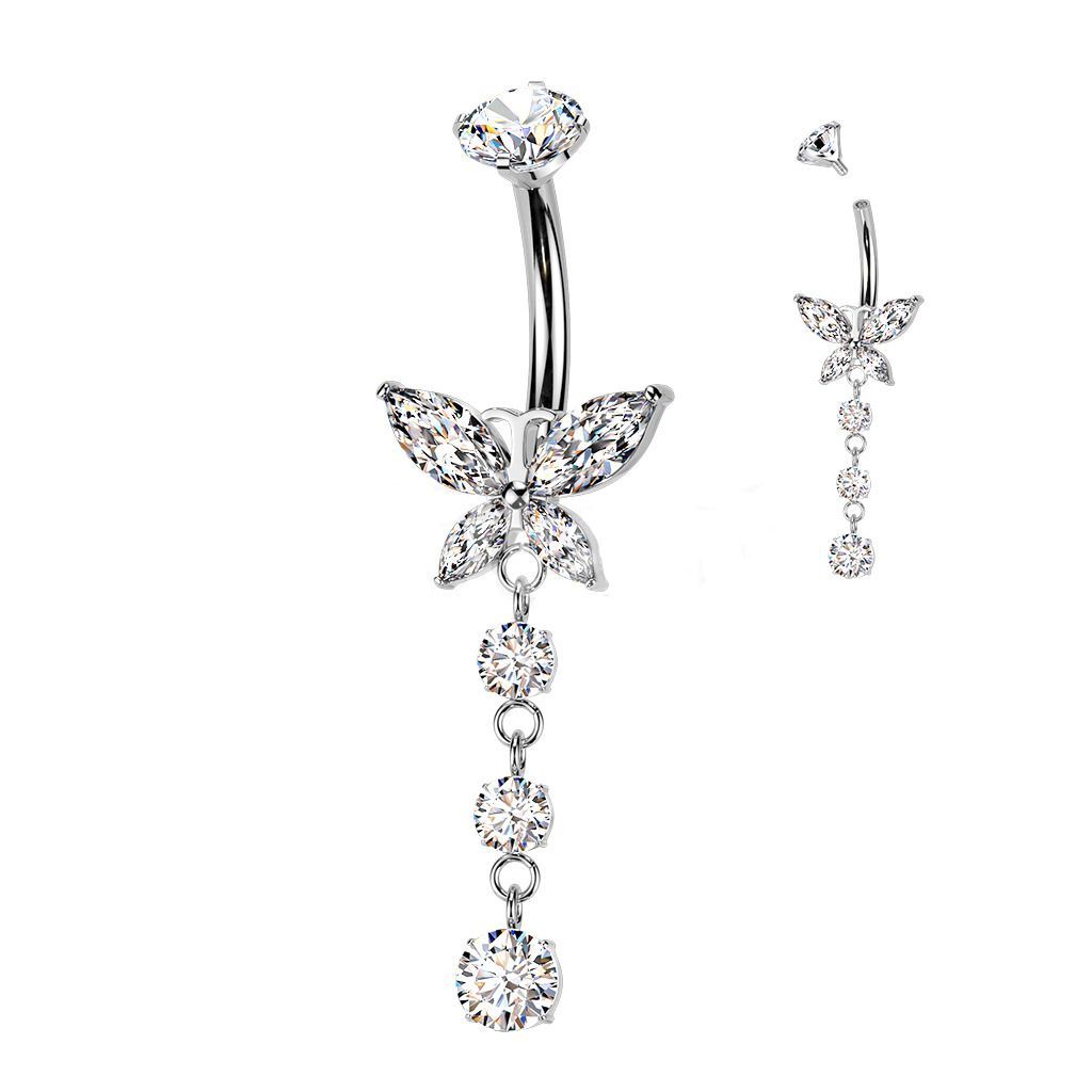 Piercing do pupíku z titanu G23 s motýlem s visací ozdobou. Ozdoba je zdobena čirými zirkony.