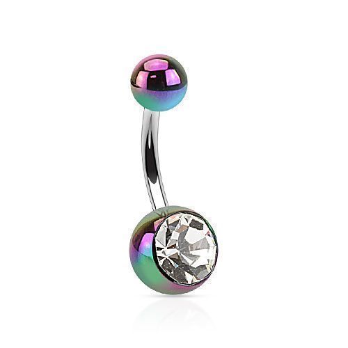 Piercing do pupíku - banánek s kuličkami v perleťové barvě, velká kulička osazená čirým zirkonem.