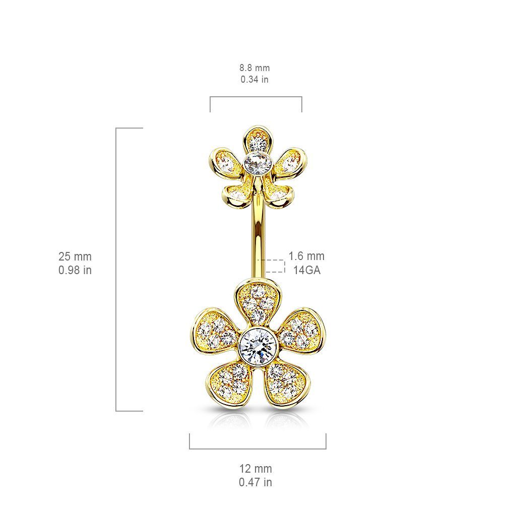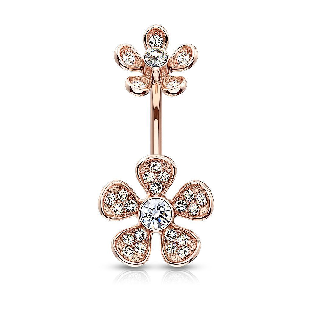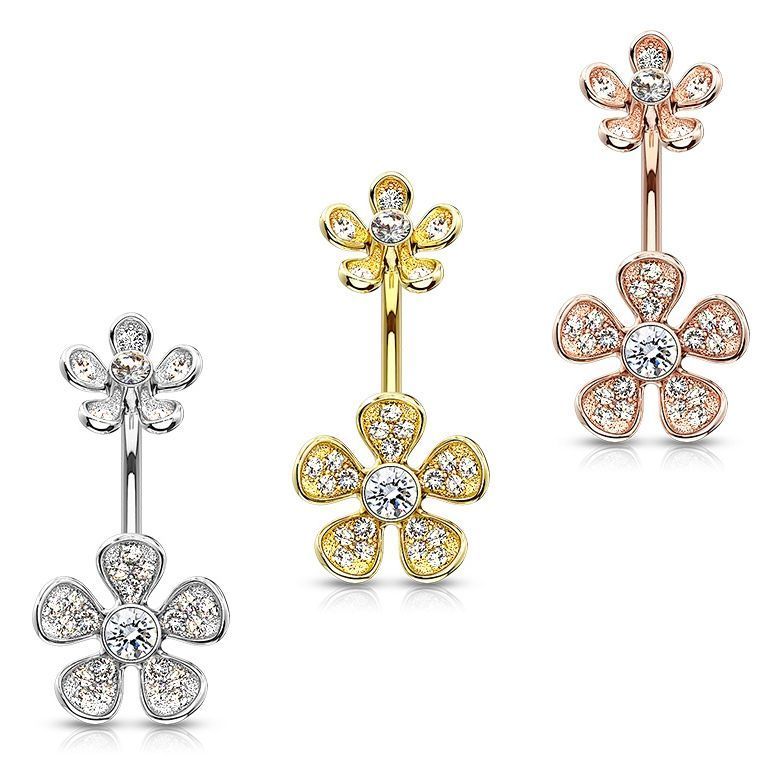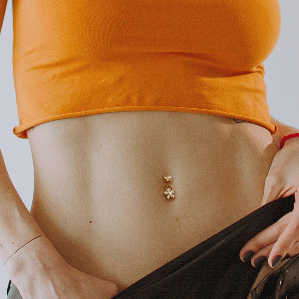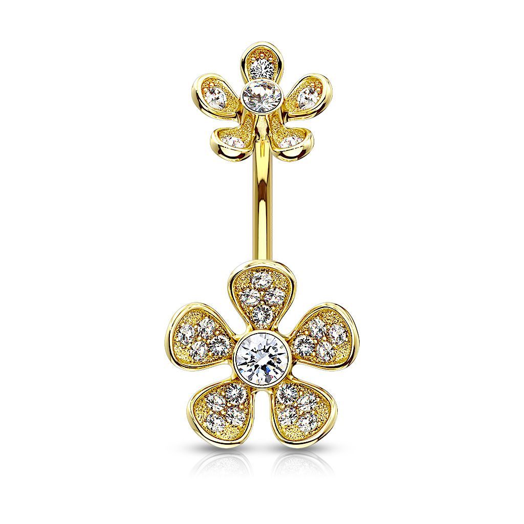 Piercing banánek do pupíku zdobený kvítky. Kytičky jsou zdobené čirými zirkony.
