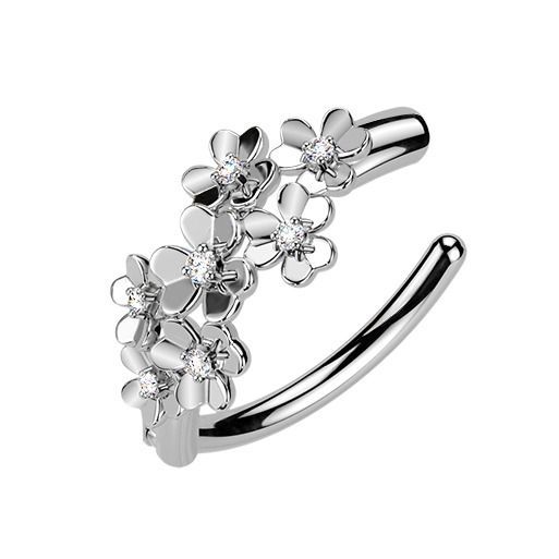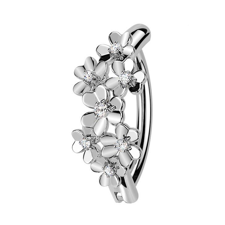 Piercingový šperk určený pro piercing pupíku. S ozdobou kytiček. Kytičky jsou zdobeny čirými zirkony.