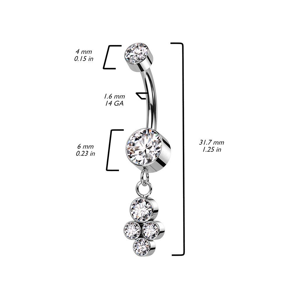 Titanový piercing do pupíku s visací ozdobou. Piercing osazený zirkony.