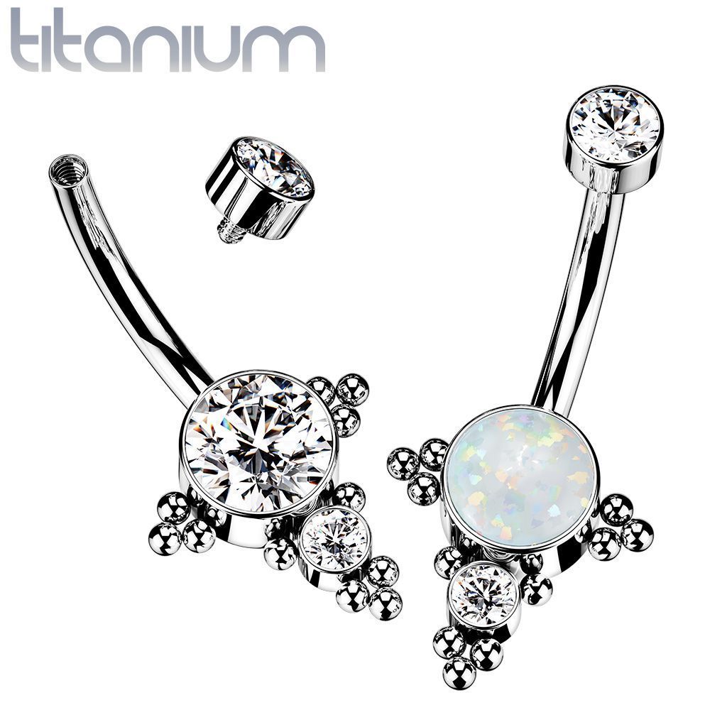 Titanový piercing do pupíku osazený syntetickým opálem a zirkony..